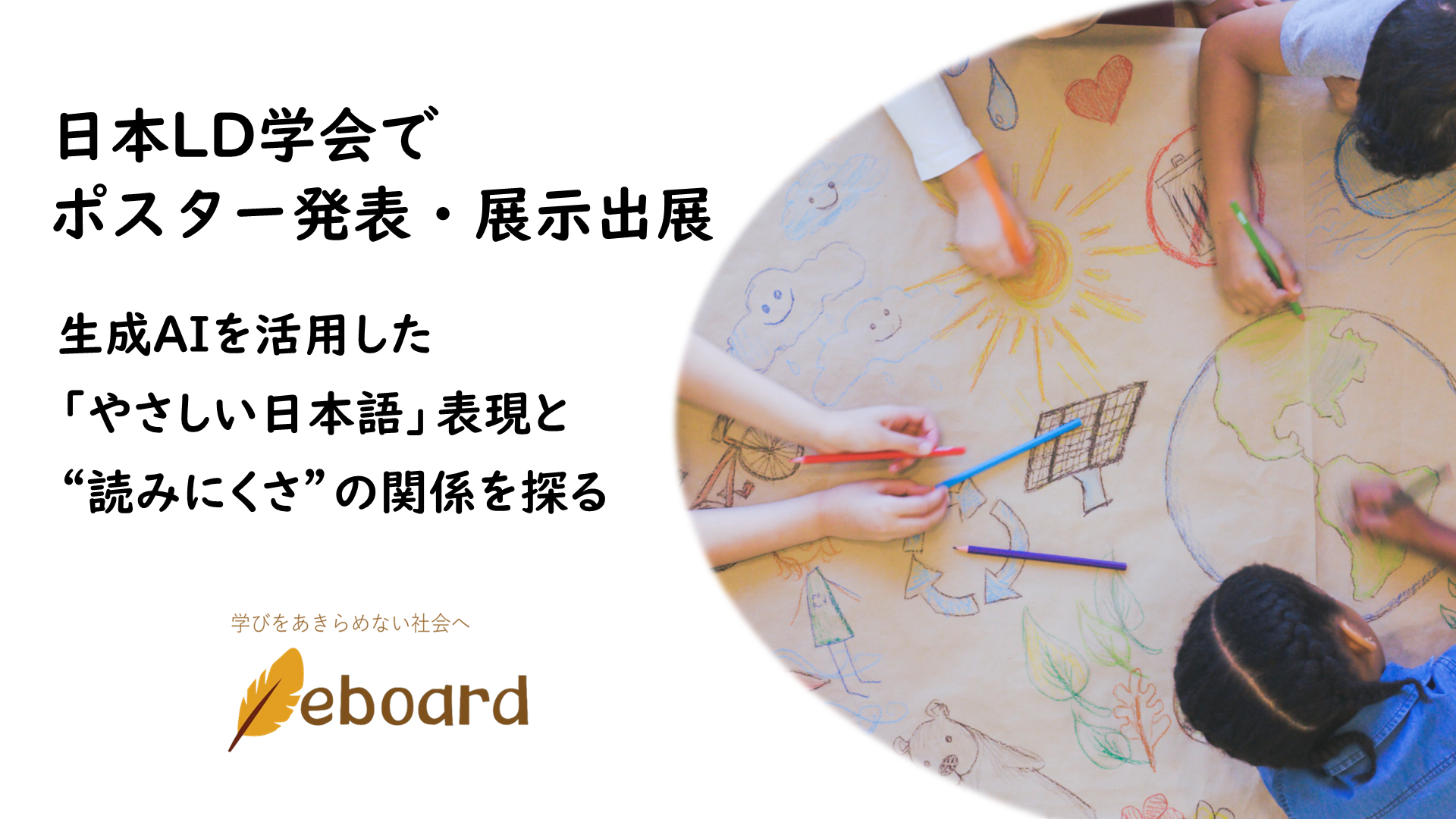 NPO法人eboardは、早稲田大学の髙橋麻衣子先生とともに、生成AIによる「やさしい日本語」表現が成人の”読みにくさ”に与える影響を調査し、ICTを活用した読解支援の実用可能性を探りました。この研究成果について、学習障害(LD)支援の専門家が一堂に会する日本LD学会においてポスター発表を行います。