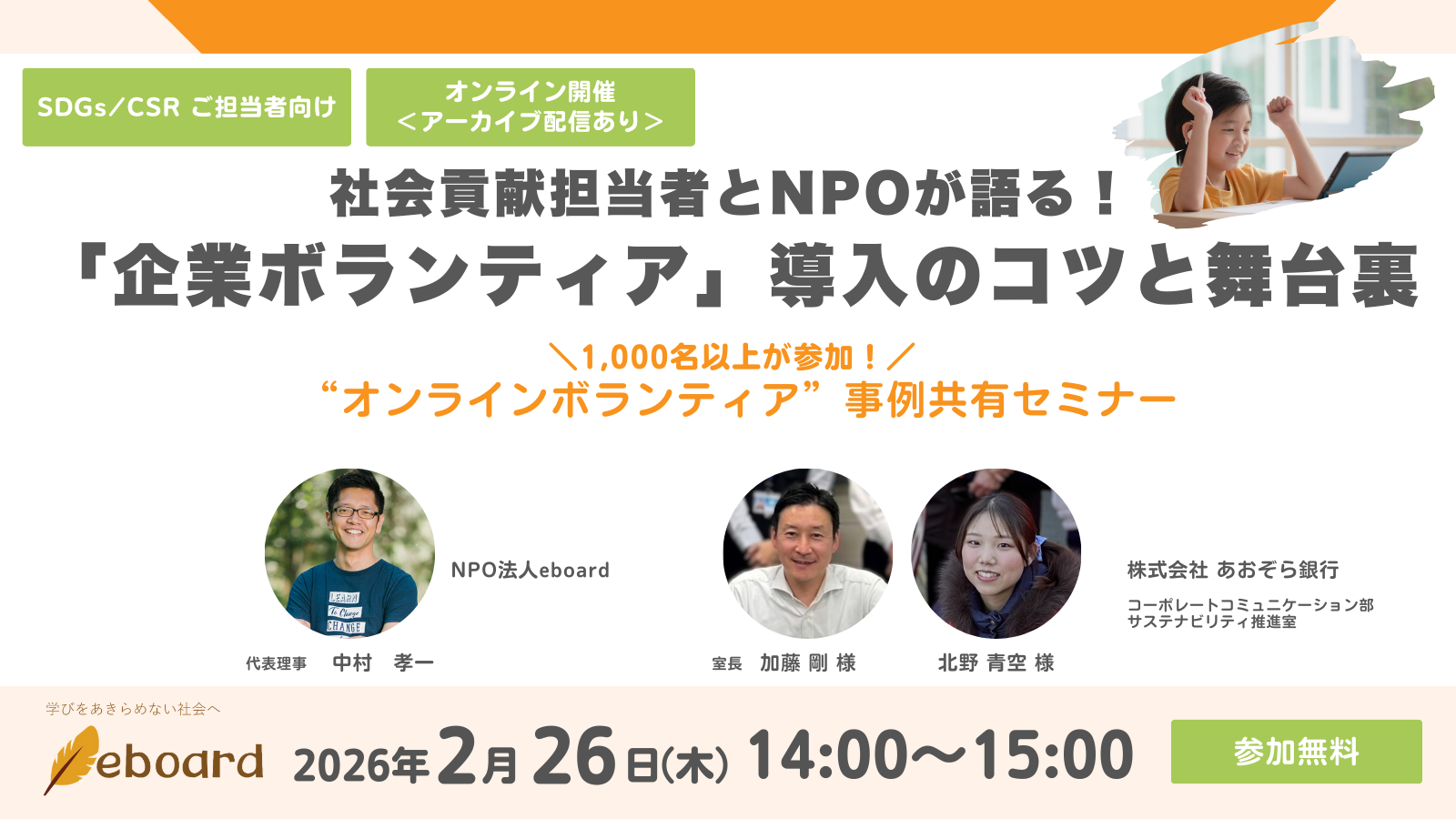 アーカイブ配信もご用意しています。eboardボランティアへの参加の有無は問いませんので、企業としてボランティアを検討されている方はもちろん、 「まずは勉強会として参加したい」「具体的な事例を知りたい」という方も、お気軽にご参加ください。