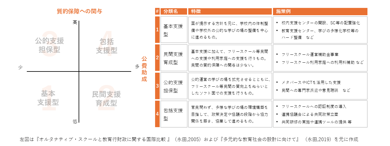 国内外の民間の多様な学びの場に関する行政の関わり方についての先行研究をもとに、「公費助成」の度合いと「質的保障への関与」の2軸によって、自治体の不登校支援モデルを4類型に分類しました。