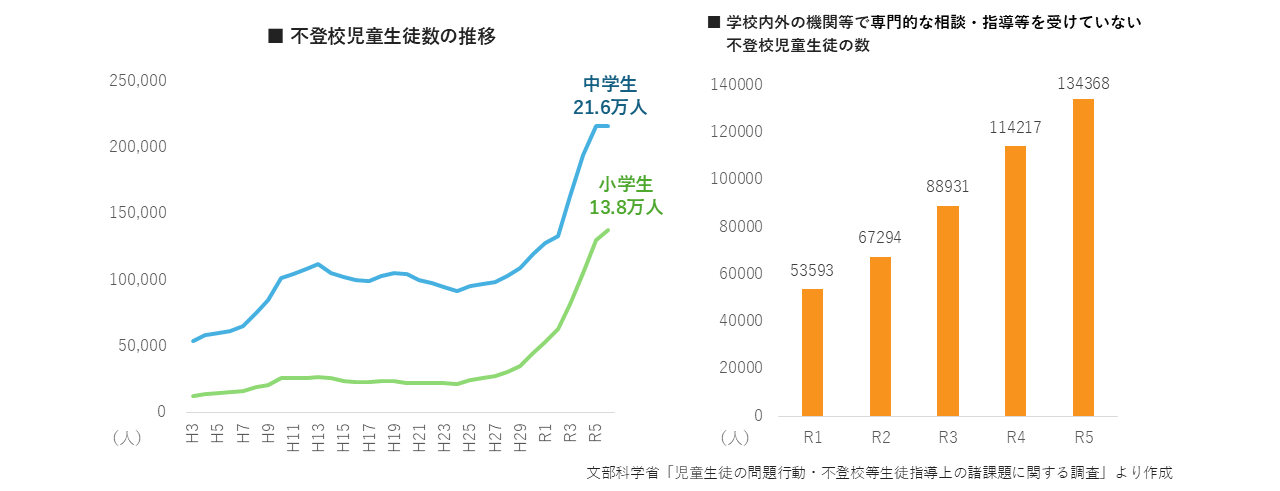 文部科学省の調査(※)によると、不登校児童生徒の数は現在35万人を超え、過去10年間で、小学生の不登校は5.3倍、中学生は1.4倍にと、増加の一途をたどっています。それに伴い、サポートを受けられていない子どもも増加しており、およそ「3人に1人」が専門的な相談・指導等を受けられておらず、従来の公的支援の枠組みだけでは対応が困難な状況にあります。