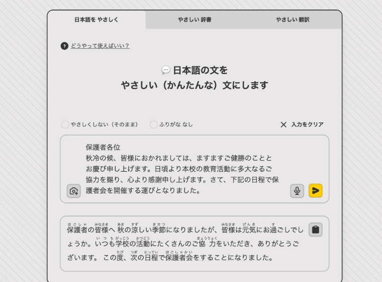 生成AIを活用したやさしい日本語への変換ツールと翻訳ツールで、生徒・先生・保護者の円滑なコミュニケーションや学びを支えます。